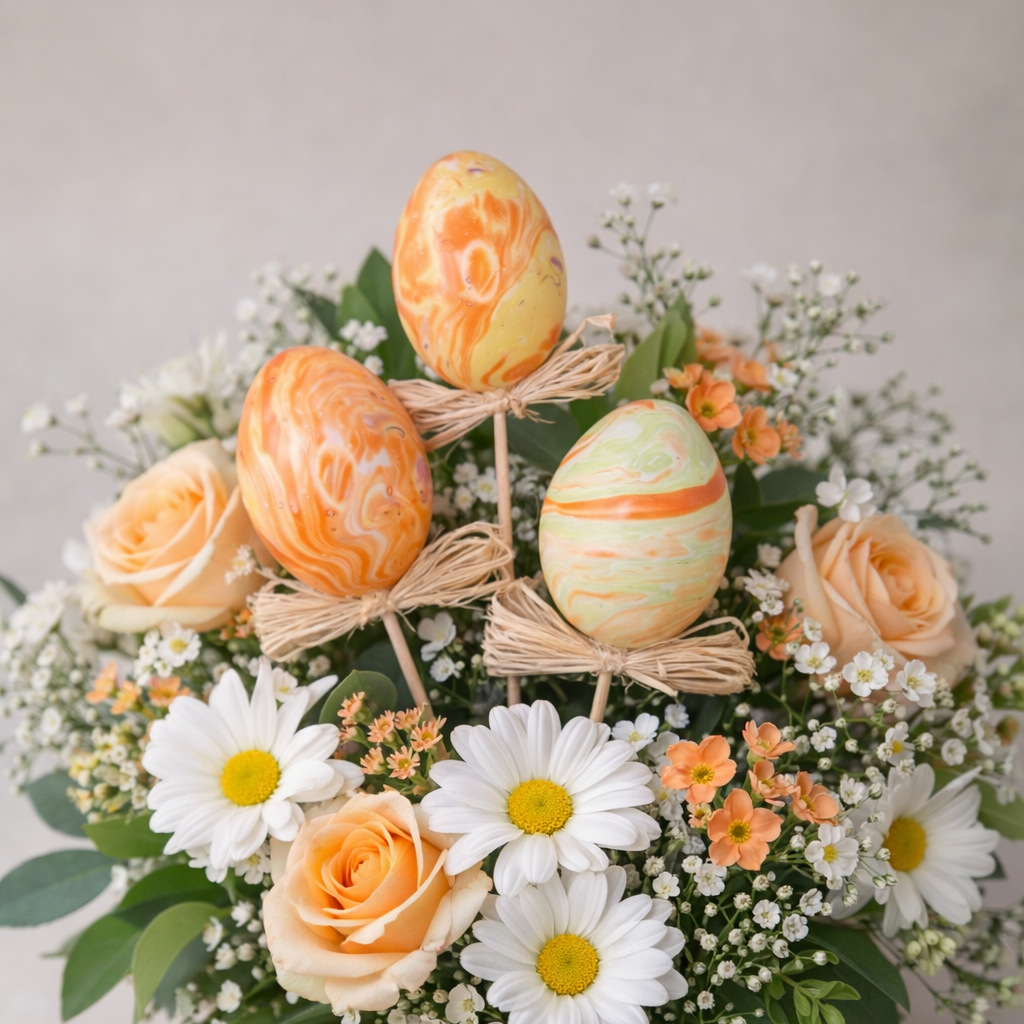 🌟3 Orange marmorierte Ostereier auf Holzstäbchen.
