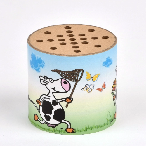 Mechanische Brummstimme-Dose im Kuh-Design (Ø 8 × 8 cm): Per Kippen erklingt ein nostalgisches Brummen ganz ohne Batterien. Handgefertigt in Thüringen, 95 % biologisch abbaubar und CE-geprüft.