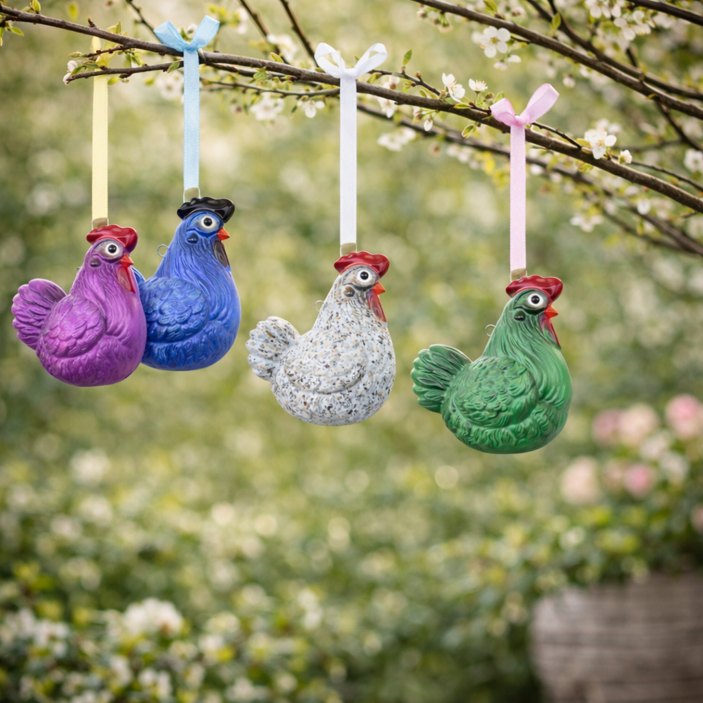 4 Hennen im Set in den Farben pink, blau, gepunktet und grün. * 20x11x17cm *Handlackiert * Wetterfest * Mit Metallöse