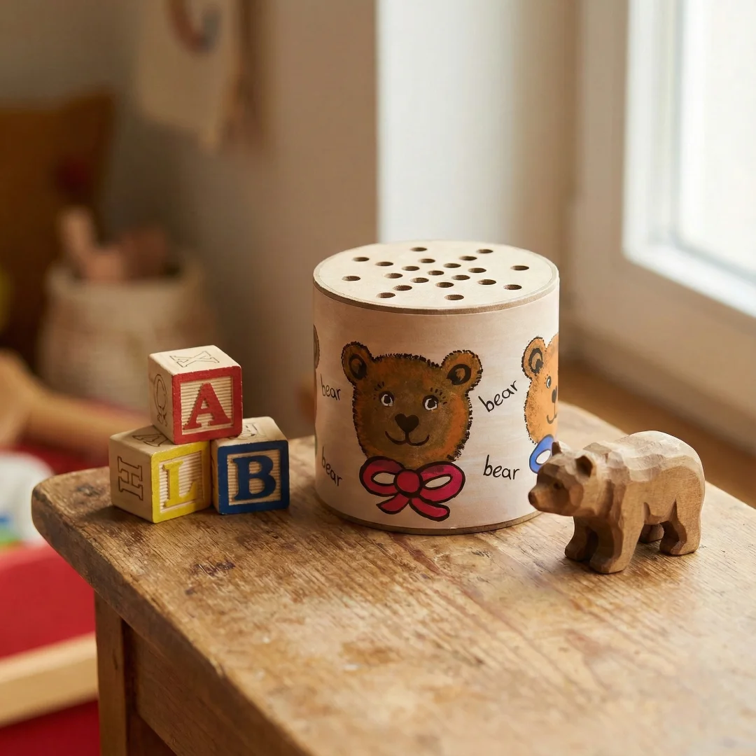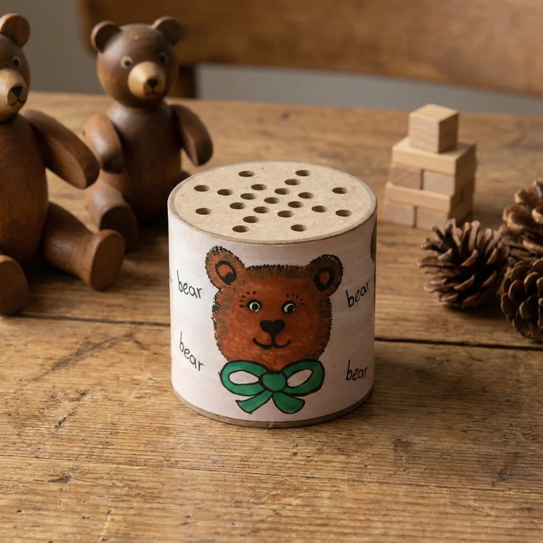 Erleben Sie nostalgische Klangkunst im Miniaturformat mit unserer mechanischen Brummstimme-Dose. Das Design zeigt ein charmantes Bärentrio und verleiht jedem Kuscheltier oder Deko-Objekt einen individuellen Touch. Per einfachem Kippen erzeugt die Dose ein warmes, tiefes Brummen. Die Funktion ist rein mechanisch und batteriefrei, sodass der Ton unbegrenzt oft wiederholbar ist.
