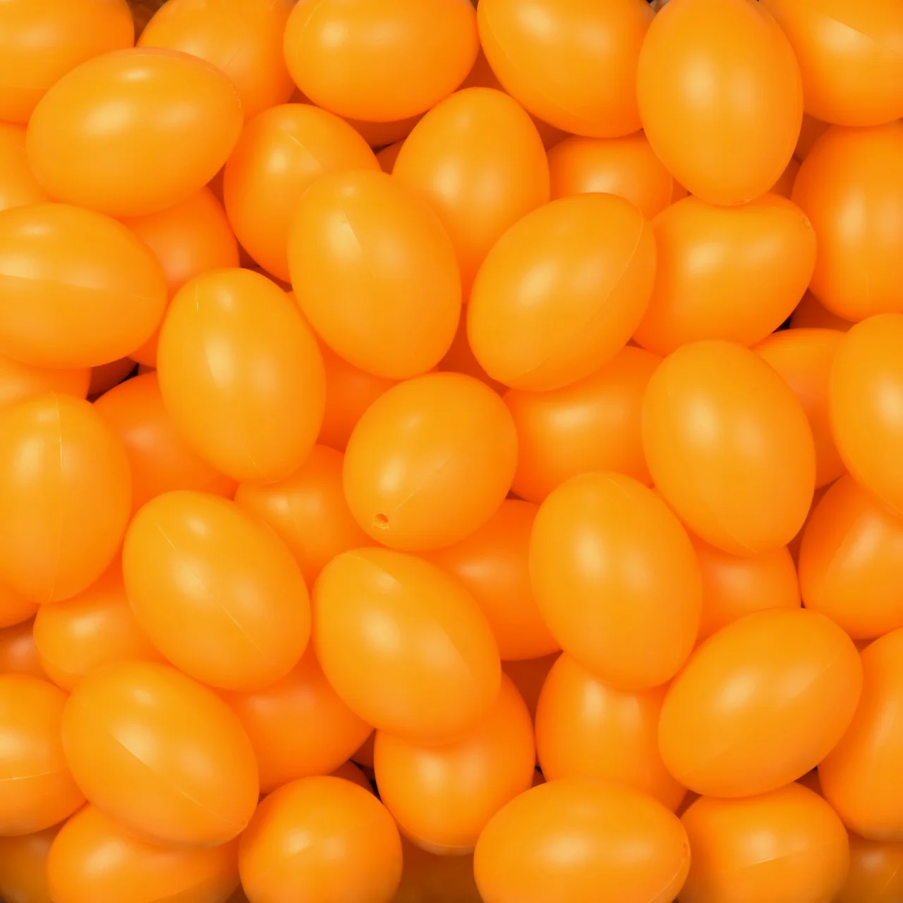 Orangefarbene Kunststoff-Ostereier (60 mm) mit Aufhänger. Erhältlich im 24er oder 100er Set. Leuchtender, fröhlicher Osterschmuck. Ideal für kreative Basteltechniken. Langlebig und robust für Drinnen und Draußen. Deutsche Qualitätsware.